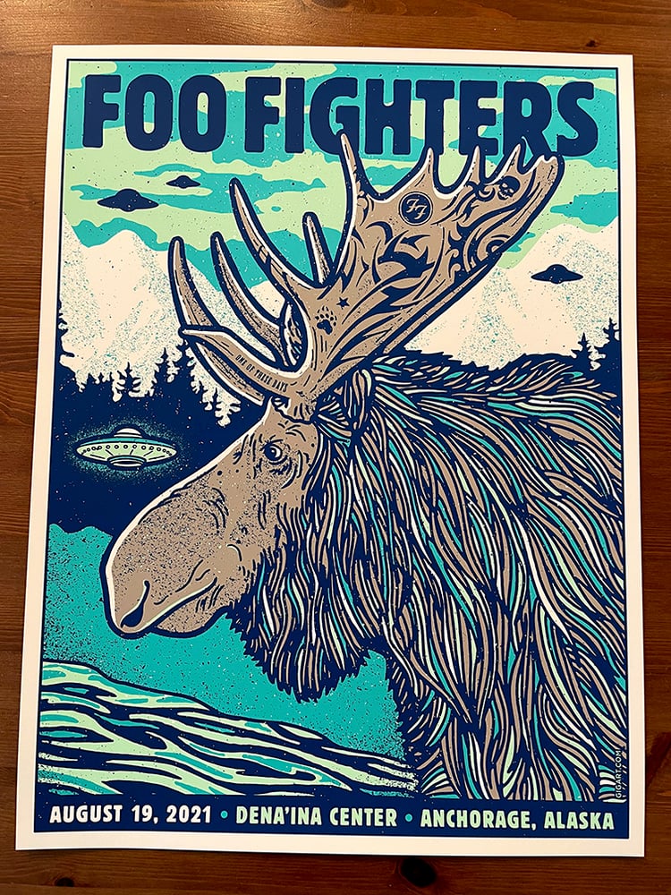 This poster was created for the Foo Fighters and their second of two shows in Alaska at the Dena'Ina Center in Anchorage on August 19, 2021.