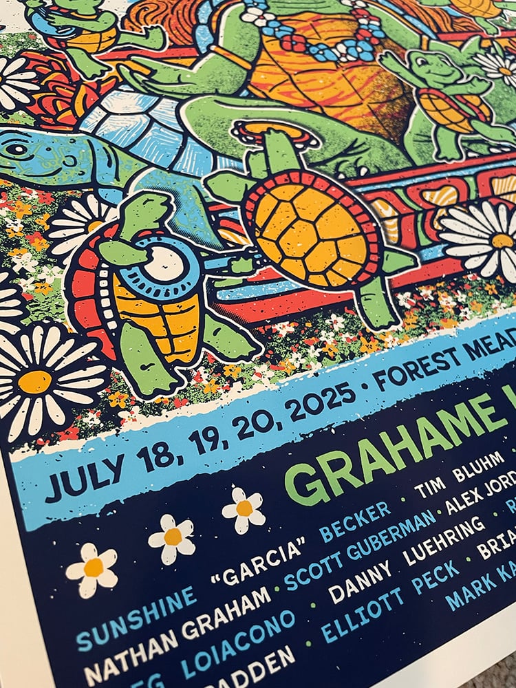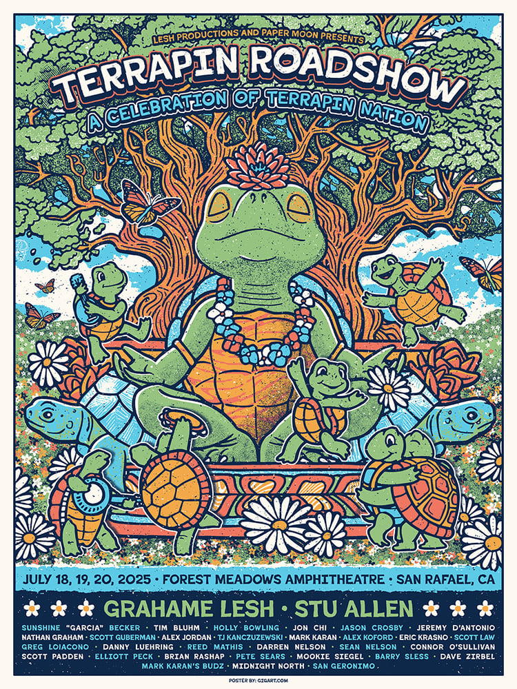 GIGART was asked by the Lesh family to create this poster for their Terrapin Roadshow on July 18-19-20, 2025 at Forest Meadows Amphitheatre in San Rafael, CA.